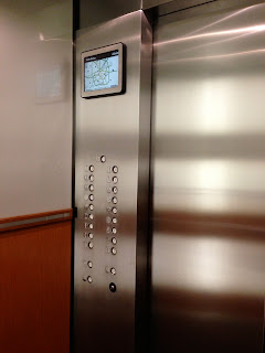 At the end of the day I head for the elevators, very eager to get in and get the first leg of my journey home behind me. A few years ago they installed what I can only describe as mini-TVs in the elevators that scroll news, weather, stock prices, and various advertisements. Apparently a 15 second elevator ride is too boring and we must be stimulated at all times, don'tcha know?